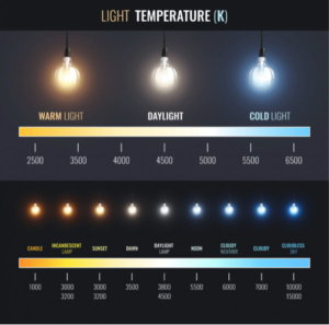 Salah satu faktor atau indikator yang dapat dimainkan dalam pencahayaan adalah warna atau CCT. CCT kepanjangan dari Correlated Color Temperature. CCT merupakan nilai warna yang dihasilkan oleh sumber cahaya seperti lampu. CCT ini diukur oleh satuan suhu Kelvin. Semakin rendah nilai Kelvin yang terdapat pada lampu, maka warnanya akan semakin memerah, sebaliknya jika nilai Kelvin semakin tinggi, maka warna lampu akan semakin kebiruan. Berikut ini adalah mood yang dapat diciptakan dari lighting diurutkan dari yang terendah.
